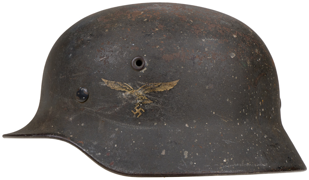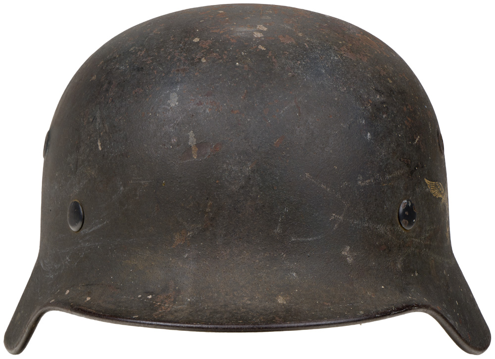 BACKGROUND: The first "modern" steel helmets were introduced by the French army in early 1915 and were shortly followed by the British army later that year. With plans on the drawing board, experimental helmets in the field, ("Gaede" helmet), and some captured French and British helmets the German army began tests for their own steel helmet at the Kummersdorf Proving Grounds in November, and in the field in December 1915. An acceptable pattern was developed and approved and production began at Eisen-und Hüttenwerke, AG Thale/Harz, (Iron and Foundry Works), in the spring of 1916. These first modern M16 helmets evolved into the M18 helmets by the end of WWI. The M16 and M18 helmets remained in usage through-out the Weimar Reichswehr, (National Defence Force, Circa 1919-1933), era and on into the early years of the Third Reich until the development of the smaller, lighter M35 style helmet in June 1935. In an effort to reduced construction time and labor costs minor modifications were introduced in March 1940 resulting in the M40 helmet. Further construction modifications were undertaken in August 1942 resulting in the M42 helmet. The Luftwaffe pattern national eagle was originally introduced for wear by Fliegerschaft, (Pilot Base), personnel of the DLV, Deutscher Luftsportsverband, (German Air Sports Association), the clandestine, civilian, forerunner of the Luftwaffe on August 18TH 1934, and adopted for wear by the Luftwaffe on March 1ST 1935 along with the national tri-color shield for wear on the helmet. The first pattern national eagle was utilized until a modified second pattern eagle was introduced in late 1936 or early 1937. Regulations of June 12TH 1940 discontinued the use of the national tri-color decal and further regulations of August 28TH 1943 abolished the national eagle decal and dictated that it was also to be removed from all helmets although the directives were not completely adhered to.