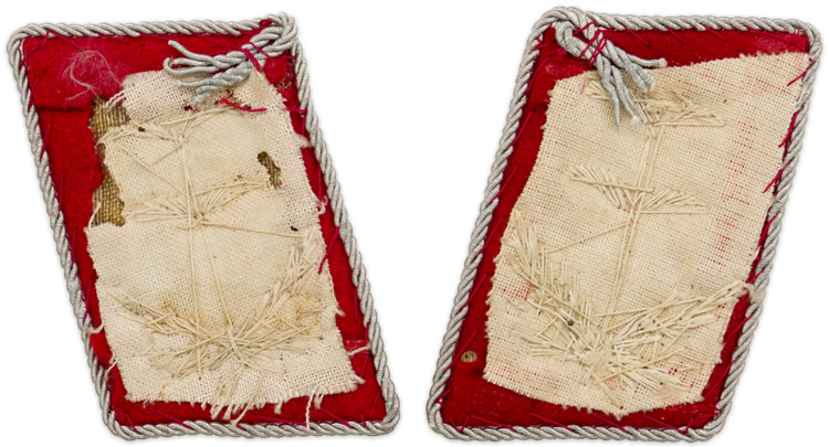 PHYSICAL DESCRIPTION: Bright red wool construction collar tabs with double, hand embroidered, rank "gulls" positioned above an oak-leaf, half-wreath in bright, silver/aluminum wire threads. The collar tabs are piped in fine, twisted, bright, silver/aluminum, cord and are mounted on tan buckram backings.