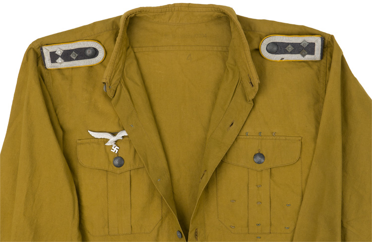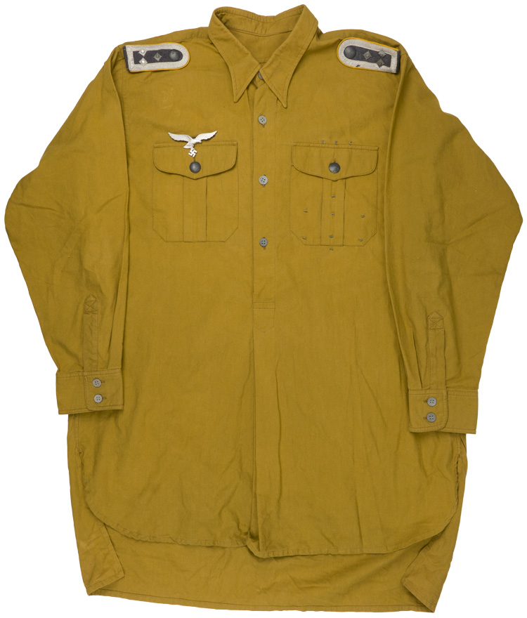 BACKGROUND: Generally all Luftwaffe personnel wore light blue/grey or blue flecked shirts for most forms of dress with a white shirt for the formal dress uniforms for Officer’s ranks and a grey shirt for the Hermann Göring Panzer units. Originally the issue shirts were the collarless style until regulations of September 1943 introduced a shirt with an integral collar to replace the earlier collarless shirts. In late 1940, with the impending German entrance into the North African campaign, the army quickly developed and issued tropical uniforms and equipment in time for DAK, Deutsches Afrika Korps, (German Africa Corps), personnel’s arrival in Tripoli in February 1941. At the same time the Luftwaffe also developed and introduced their own version of the tropical uniform and equipment independently from the other branches of service. Originally the tropical uniforms were only intended for wear in North Africa but that was later expanded to include personnel serving in southern areas of continental Europe during the summer months, (May 1ST to September 30TH). The design of the tropical uniform items were based on the standard continental uniform items but in a different color and material and included both long and short sleeve shirts with integral collars. Originally the tropical shirts were the pullover style with a four button front plaquet but later issue shirts were altered to include a full button up front closure. As with the continental shirts the tropical shirts were worn by all ranks and usually included the shoulder straps/boards as an indicator of rank and the national breast eagle. Regulations dictated that collar tabs were not to be worn on the shirts. Officers and certain senior NCO ranks were responsible for purchasing their own uniforms and as a result were allotted a clothing allowance through the Luftwaffe’s Verkaufabteilung, (Air-Force Sales Department), system. The Officers and certain senior NCO’s could choose to purchase their uniforms from the armed forces clothing depots or to privately purchase garments of higher quality. Although enlisted personnel were issued their uniforms from government supplies they were also permitted to purchase privately tailored uniforms although the price may have been restrictive.
