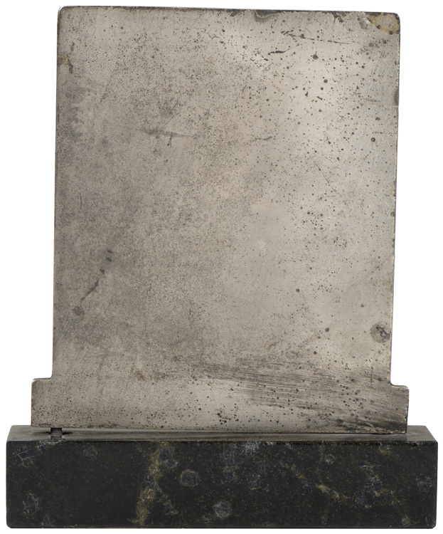 Cast metal construction with a marble base. 18cm x 15cm. One of the screws that hold the plaque on is stripped, but the other still holds it in place.