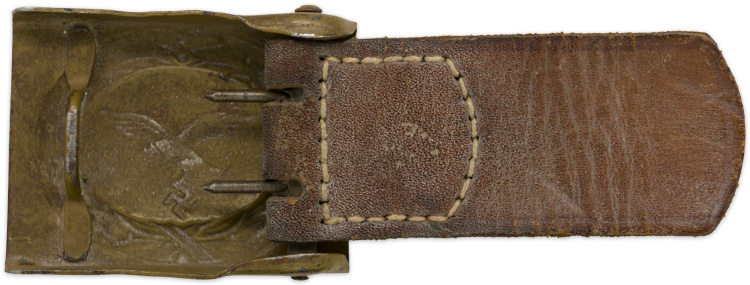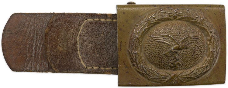 Military belts and their corresponding buckles date back centuries and were initially designed for attaching swords and daggers. In 1847 a new innovative box buckle with a quick release catch and corresponding belt were introduced which resulted in a Prussian, Hauptmann Virschow, initiating a new method of carrying personal equipment with the belt and shoulder straps supporting the majority of the weight. This system, with modifications, remains in use in most of the armies in the world to this day. During the Third Reich there was a prescribed form of wear of the belt and buckle with the buckle being positioned on the right side and the corresponding buckle catch on the left side. First introduced on May 20TH 1935, the Luftwaffe EM/NCO’s belt buckle underwent minor modifications in late 1937 or early 1938 with a new pattern eagle and again in 1940 with a slight difference in construction. Originally the EM/NCO’s buckles were produced with a silver finish until a blue/grey version was introduced, (Circa mid-1940), although the silver finished buckles continued to be utilized. In late 1940, with the impending German entrance into the North African campaign, the army quickly developed and issued tropical uniforms and equipment in time for DAK, Deutsches Afrika Korps, (German Africa Corps), personnel’s arrival in Tripoli in February 1941. At the same time the Luftwaffe also developed and introduced their own version of the tropical uniform and equipment independently from the other branches of service. Along with the tropical uniforms and equipment the Luftwaffe introduced a canvas web waist belt and altered the finish on the standard issue belt buckle to an olive drab coloration. Of Note: Originally military buckles produced under government contract had the addition of a leather, (canvas web for tropical buckles), tabs which were designed to help support the ammunition pouches and prevent slippage but regulations in 1942 discontinued the tabs to preserve leather although the directive was not completely adhered to.PHYSICAL DESCRIPTION: 1940 pattern, stamped steel construction, box buckle, with an olive drab finish. features a smooth outer field with a central embossed, horizontally oval, laurel leaf wreath encompassing a slightly domed, pebbled inner field with an embossed, second pattern, (Circa 1937/1938-1945), Luftwaffe eagle with out-stretched wings, clutching a canted swastika in one talon to the center. The reverse of the buckle is a mirror image of the obverse. The reverse has the brazed buckle catch, prong bar and prongs all intact. The buckle has a natural tan leather tab machine stitched around the prong bar. Tab looks to be marked to Richard Sieper & Söhne of Lüdenscheid. Nice!