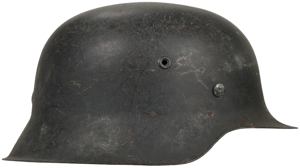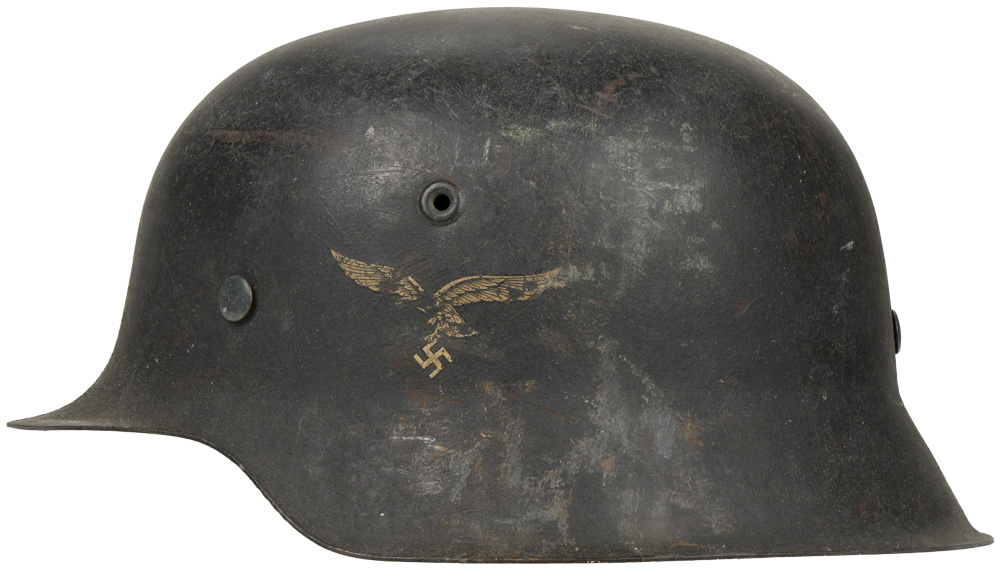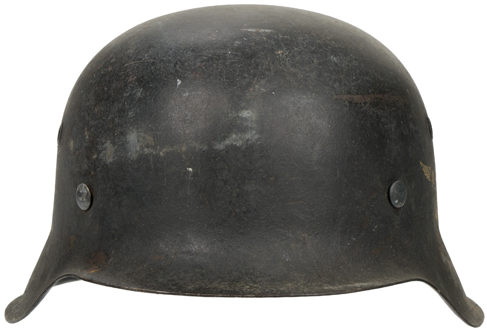 BACKGROUND: The first "modern" steel helmets were introduced by the French army in early 1915 and were shortly followed by the British army later that year. With plans on the drawing board, experimental helmets in the field, ("Gaede" helmet), and some captured French and British helmets the German army began tests for their own steel helmet at the Kummersdorf Proving Grounds in November, and in the field in December 1915. An acceptable pattern was developed and approved and production began at Eisen und Hüttenwerke, AG Thale/Harz, (Iron and Foundry Works), in the spring of 1916. These first modern M16 helmets evolved into the M18 helmets by the end of WWI. The M16 and M18 helmets remained in usage through out the Weimar Reichswehr, (National Defence Force, Circa 1919 1933), era and on into the early years of the Third Reich until the development of the smaller, lighter M35 style helmet in June 1935. In an effort to reduced construction time and labor costs minor modifications were introduced in March 1940 resulting in the M40 helmet. Further construction modifications were undertaken in August 1942 resulting in the M42 helmet. The Luftwaffe pattern national eagle was originally introduced for wear by Fliegerschaft, (Pilot Base), personnel of the DLV, Deutscher Luftsportsverband, (German Air Sports Association), the clandestine, civilian, forerunner of the Luftwaffe on August 18TH 1934, and adopted for wear by the Luftwaffe on March 1ST 1935 along with the national tri color shield for wear on the helmet. The first pattern national eagle was utilized until a modified second pattern eagle was introduced in late 1936 or early 1937. Regulations of June 12TH 1940 discontinued the use of the national tri color decal and further regulations of August 28TH 1943 abolished the national eagle decal and dictated that it was also to be removed from all helmets although the directives were not completely adhered to.