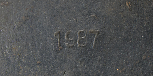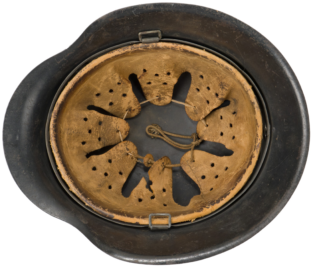 PHYSICAL DESCRIPTION: Helmet retains a good portion its rough textured Luftwaffe grey paint. Second pattern Luftwaffe eagle decal is retained about 75%. All three liner retaining rivets intact. M31 tan leather liner is complete. The reverse interior neck guard apron is lot number stamped, "1987" and the interior left side apron has stamped manufacturers code and size, "ET66", indicating manufacture by indicating manufacture byEisen und Hüttenwerke, AG Thale/Harz, size 66.