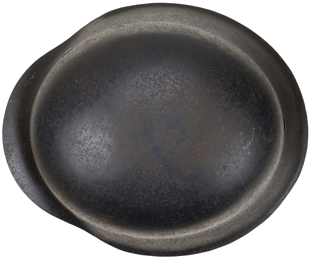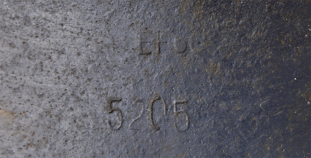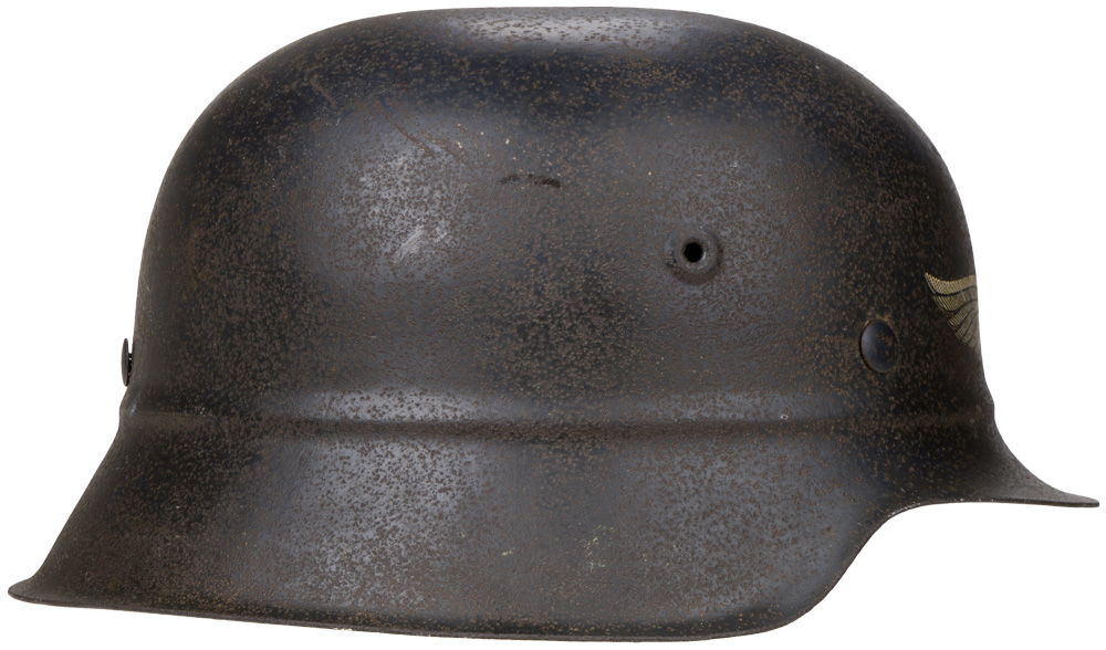 PHYSICAL DESCRIPTION: Stamped sheet steel construction, M42 style helmet with the addition of an embossed horizontal "bead" positioned at the apex of the front and rear visors and crown. The helmet retains a good portion of its original blue/grey finish with the expected crown wear. The front center of the helmet has a Luftschutz emblem decal in place. The black detailed, silver decal features stylized spread wings with a central oak-leaf sprig and a canted swastika positioned below a scripted banner, "Luftschutz". The helmet has an embossed cut-out ventilation hole to each side of the crown and all three of the liner retaining rivets are intact. Original ersatz liner and chinstrap are complete. Liner is a bit miss-shaped, but all complete. Maker marked size "EF66" indicating manufacture by Emaillierwerk, AG Fulda, size 66. M42 beaded examples are fairly scarce to find. Decent example showing honest period wear.