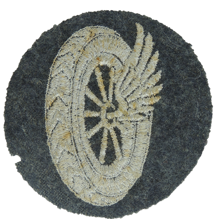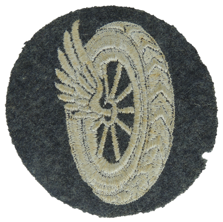 PHYSICAL DESCRIPTION: The badge consists of a roughly, 55mm diameter Luftwaffe blue/grey wool base with a machine embroidered, seven spoked wheel rim and tire with an upward swept wing emanating from the central hub all in silvery/grey threads. The embroidery shows nice detailing including treads to the tire.