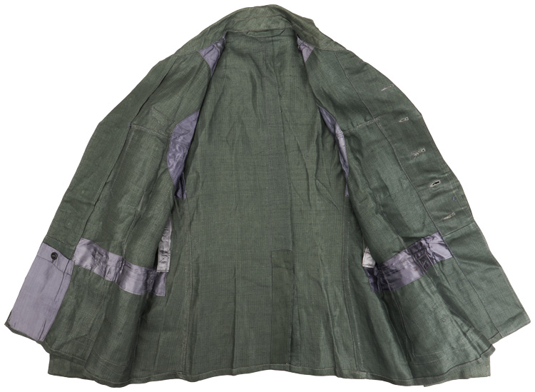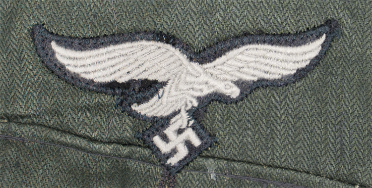 PHYSICAL DESCRIPTION: Reed green, cotton/rayon blend construction field blouse with an HBT, (Herring Bone Twill), weave features a vertical, six button, front closure with a single metal hook and eye positioned at the forward neckline and a lay down collar. The field blouse has four, non-pleated, front pockets with straight edged, button down flaps. The breast pockets are the standard patch type while the hip pockets are the saddle bag type with expanding side panels. The right breast has a second pattern, (circa 1936/1937-1945), machine embroidered, Luftwaffe breast eagle in silvery/grey rayon threads on a cut-out, reed green cotton/rayon base. The eagle is machine stitched to the field blouse in the typical zig-zag fashion. The side panels of the field blouse each have three, vertically aligned, stitched eyelets to either side at the waistline for the belt support hooks. The bent, magnetic wire belt support hooks are included. The reverse of the field blouse has dual, vertical tapering darts and a central, vertical, tail skirt vent. The straight cut sleeve have dual-ply, hemmed, cuffs and a small, vertical, slash to the outside seams with dual fit adjustment buttons to each. Fabric shoulder strap retaining loops and buttons are intact. The interior of the field blouse is partially lined in grey rayon at the shoulder seams, around the arm openings and down the side panels. The lining has a vertical, grey, rayon strap with four, stitched, eyelets to each side panel at the waistline for the belt support hooks. The forward right tail skirt has a field dressing pocket with a single button closure. All of the original collar liner attachment buttons are intact. Nice markings. The front closure and exterior pocket buttons are all the removable Luftwaffe blue/grey painted, pebbled alloy type and are secured to the field blouse by opened "S" rings. The shoulder strap buttons are also the removable Luftwaffe blue/grey painted, pebbled alloy type and are stitched to the field blouse. The pebbled alloy buttons all of their original blue/grey paint. The field blouse is roughly size 38" chest. Original factory is included and inside the upper right pocket. Super mint and nice!!