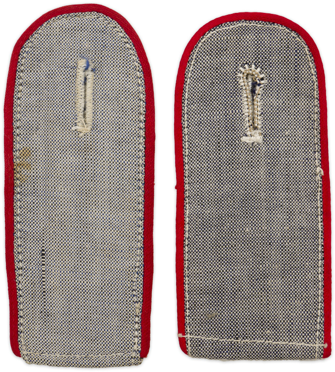 PHYSICAL DESCRIPTION: Light weight, flecked blue/grey cotton construction, slip on shoulder straps with bright red rayon waffenfarbe piping. The bottom of the straps and the slip on retaining tongues are also in light weight, flecked blue/grey cotton.
