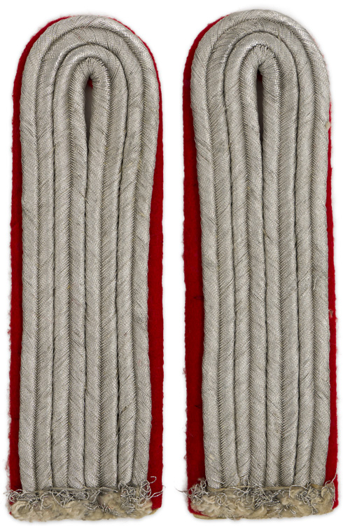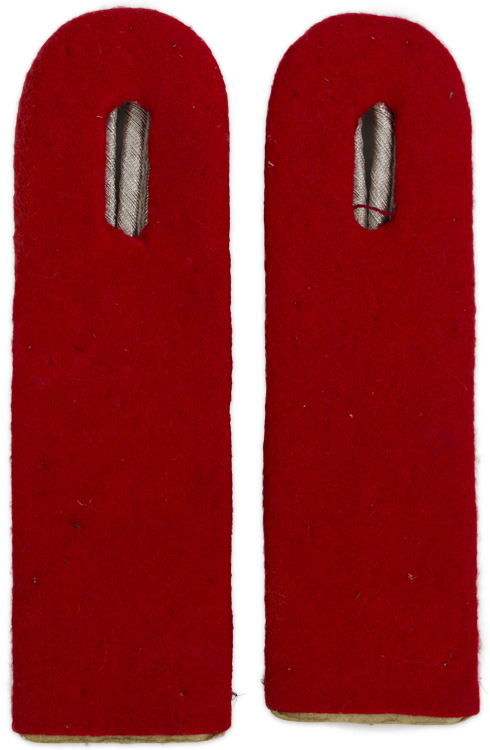 PHYSICAL DESCRIPTION: Sew on shoulder boards in bright silver/aluminum Russian braid mounted on bright red wool waffenfarbe bases.