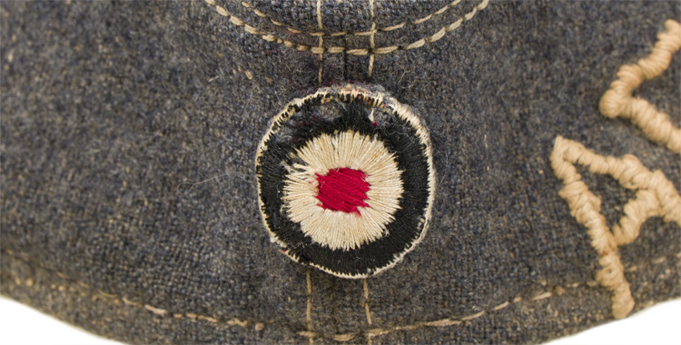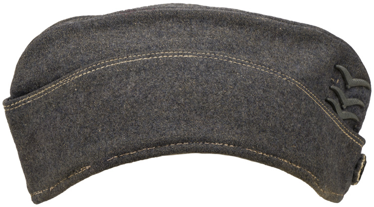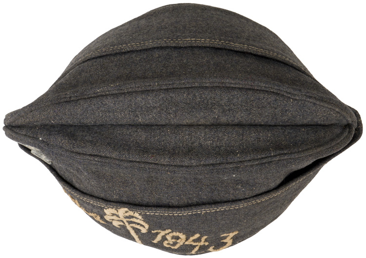 PHYSICAL DESCRIPTION: Luftwaffe blue/grey, wool/rayon blend construction cap features fold down side and back panels with gently sloping, downward scallops to the front and forward sides. Eagle has been removed and the veteran added 3 rank gulls to each side plus the hand embroidered "Afrika 1943". Front center of the fold down panels has a machine embroidered, national tri-color cockade in black, white and red rayon threads. The interior of the cap is fully lined in blue/grey cotton/rayon. Roughly a size 58. Very cool soldier or POW piece.