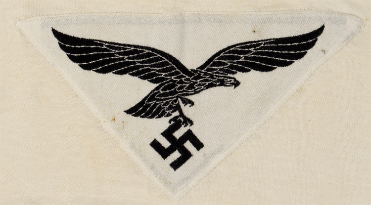 PHYSICAL DESCRIPTION: Stretchy, standard issue, white tricot construction, tank top style, sports shirt with vertical side seams and low, circular, boat-cut neck line. Front center of shirt has a black, machine woven, M35 pattern, Luftwaffe sport shirt eagle on an inverted, ribbed white rayon, triangular base. Base is machine stitched to shirt. Interior neck and sleeve openings are lined in white cotton tape and shirt tail is hemmed. The chest measures approximately 36". The darl collar ring indicates NCO rank. NCO examples don’t turn up often.