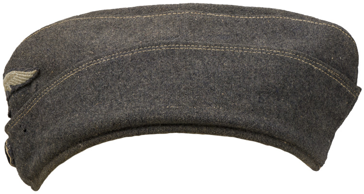 PHYSICAL DESCRIPTION: Luftwaffe blue/grey, wool/rayon blend construction cap features fold down side and back panels with gently sloping, downward scallops to the front and forward sides. The front center of the cap has a machine embroidered, second pattern, (Circa 1936/1937-1945), Luftwaffe eagle clutching a canted, swastika in one talon, in pale silvery/grey cotton threads mounted on a cut-out, blue/grey, wool base and the front center of the fold down panels has a machine embroidered, national tri-color cockade in black, white and red rayon threads. Both the eagle and the cockade are neatly handstitched in place. The interior of the cap is fully lined in blue/grey cotton/rayon. Roughly a size 58.