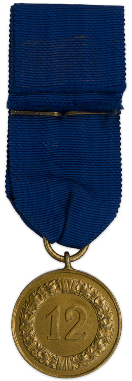 PHYSICAL DESCRIPTION: Gilt washed, die struck, magnetic metal, third class award for twelve years service. The award features an embossed Wehrmacht style eagle with down-swept wings encompassed by Gothic script, "Treue Dienste in der Wehrmacht" (Loyal Service in the Armed Forces), on a smooth background field to the obverse. The reverse has a large embossed numeral, "12", to the center encompassed by an embossed circular oak-leaf wreath also on a smooth background field. The ribbon suspension loop and ring are both intact. The award comes complete with a piece of original cornflower blue, moiré, ribbed rayon ribbon with a gilt washed, Luftwaffe national eagle cypher.
