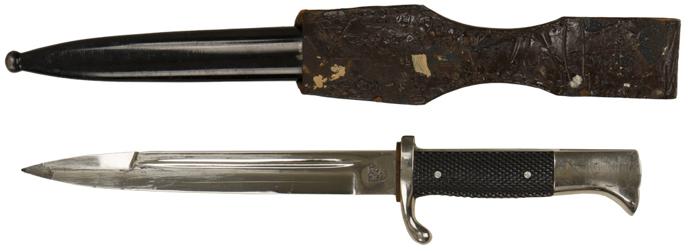 PHYSICAL DESCRIPTION: The bayonet has a roughly, 7 7/8", (20cm), long, nickel/silver plated, drop forged, steel construction blade with a wide fuller to each side and a full length, including the hilt of roughly, 12 3/4", (32.5 cm). The blade is in overall very good, clean, bright condition with minor scabbard runner marks. The reverse ricasso is well marked with acid etched manufacturer’s logo for Daniel Krebs. The reddish/brown leather washer is still intact. The bayonet has a nickel/silver plated, tooled alloy, crossguard with one up-swept arm, a "flash guard" and a stylized eagle head pommel. The bayonet has diamond grooved, molded, black bakelite grips which are secured to the hilt by two, small, dome headed, steel rivets. The "TO" slotted, stylized eagle head pommel and stud button are intact and the stud button still functions. The bayonet comes complete with it’s original, black painted, oval tipped, sheet metal scabbard. The bayonet also comes with a nice quality, private purchase, brown, patent leather frog.