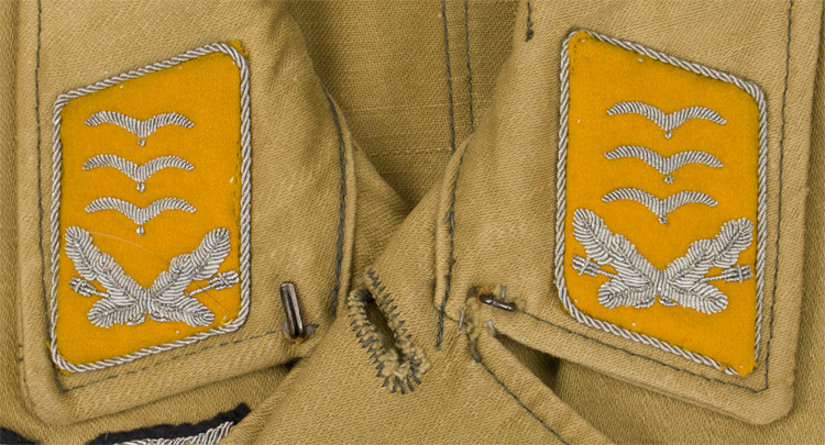 BACKGROUND: The Reichsluftwaffe, (National Air-Force), was officially established on February 26TH 1935 as the third branch of service of the Wehrmacht, (Armed Forces). On March 9TH 1935 the formation of the new Reichsluftwaffe was announced to the foreign press and on March 16TH conscription was reintroduced for all three branches of service. On May 21ST 1935 the Reichsluftwaffe designation was altered to Luftwaffe, (Air-Force). In late 1940, with the impending German entrance into the North African campaign, the army quickly developed and issued tropical uniforms and equipment in time for DAK, Deutsches Afrika Korps, (German Africa Corps), personnel’s arrival in Tripoli in February 1941. At the same time the Luftwaffe also developed and introduced their own version of the tropical uniform and equipment independently from the other branches of service. Originally the tropical uniforms were only intended for wear in North Africa but that was later expanded to include personnel serving in southern areas of continental Europe during the summer months, (May 1ST to September 30TH). The design of the tropical uniform was based on the standard continental uniform but were in tan as opposed to the continental blue/grey and were usually manufactured in light weight cotton. The Luftwaffe tropical uniform remained basically unchanged for the duration of the war with minor modifications. Regulations dictated that collar tabs were not to be worn on the tropical tunics/field blouses and additional regulations restricted mixing the continental blue/grey uniform items and insignia, with the tropical tan uniform items and insignia although period photographs indicate that both regulations were not strictly adhered to. The different branches of service within the Luftwaffe were allocated specific, identifying, waffenfarbe, (Branch of Service Color), with golden yellow being chosen for personnel serving with the Flieger, (Flight) units which was generally displayed as piping on the shoulder strap/boards of the tropical field blouses and service tunics. Officers and certain senior NCO ranks were responsible for purchasing their own uniforms and as a result were allotted a clothing allowance through the Luftwaffe’s Verkaufsabteilung, (Air-Force Sales Department), system. The Officers and certain senior NCO’s could choose to purchase their uniforms from the armed forces clothing depots or to privately purchase uniform items of higher quality. Although enlisted personnel were issued their uniforms from government supplies they were also permitted to purchase privately tailored uniforms although the price may have been restrictive.