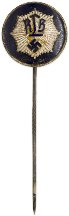 PHYSICAL DESCRIPTION: Roughly, 20mm diameter, die struck alloy construction, first pattern, (circa 1933-1938/39), RLB emblem, lapel pin with bright silver washed and mid-blue enameled finishes. The pin features a mid-blue, enamel base with a central, embossed, forty-eight point, silver washed, sunburst pattern with the superimposed, stylized, mid-blue enameled, initials, "RLB" to the center, positioned above a small, canted, mid-blue, enameled, swastika. The reverse of the pin is well marked with the embossed, manufacturer’s name and location and, "Ges. Gesch.", indicating, Gesetzlich Geschützt (Protected by Law). Complete with its original 50mm rifled pin.