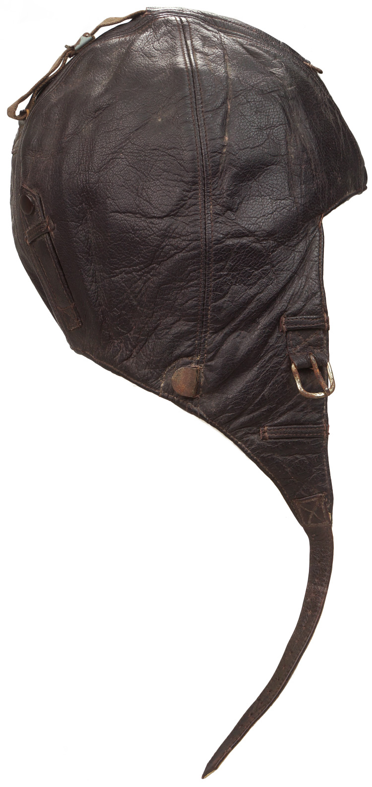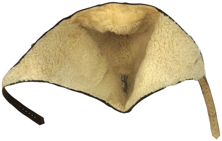 PHYSICAL DESCRIPTION: Nice quality, five panel, brown, grained kid leather construction winter flight helmet with magnetic sheet metal and alloy fittings and a white sheep’s wool lining. All complete and in excellent condition. Size marked 57.