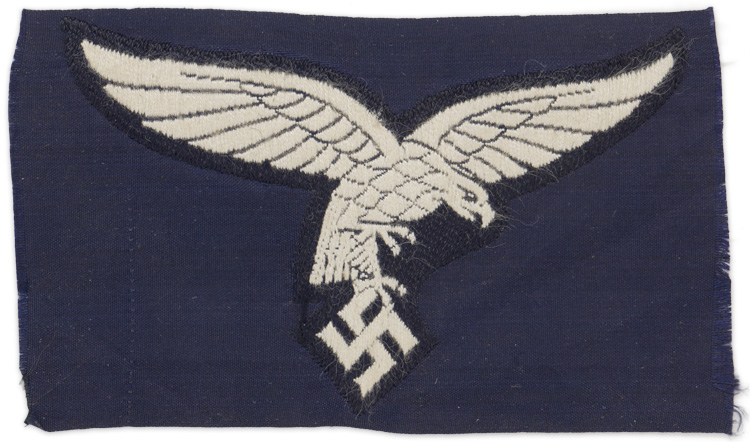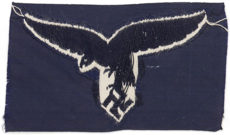 PHYSICAL DESCRIPTION: Machine woven, second pattern, Luftwaffe eagle in white threads on a woven navy blue rayon base. The eagle has a roughly 95mm wingspan and is still on its original navy blue rayon factory roll.