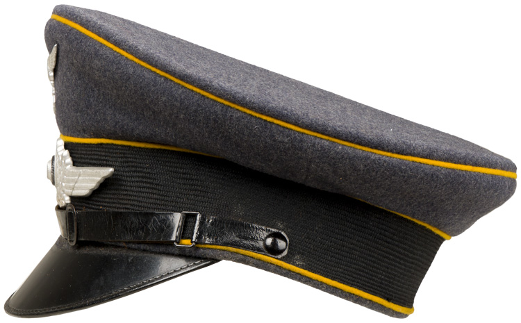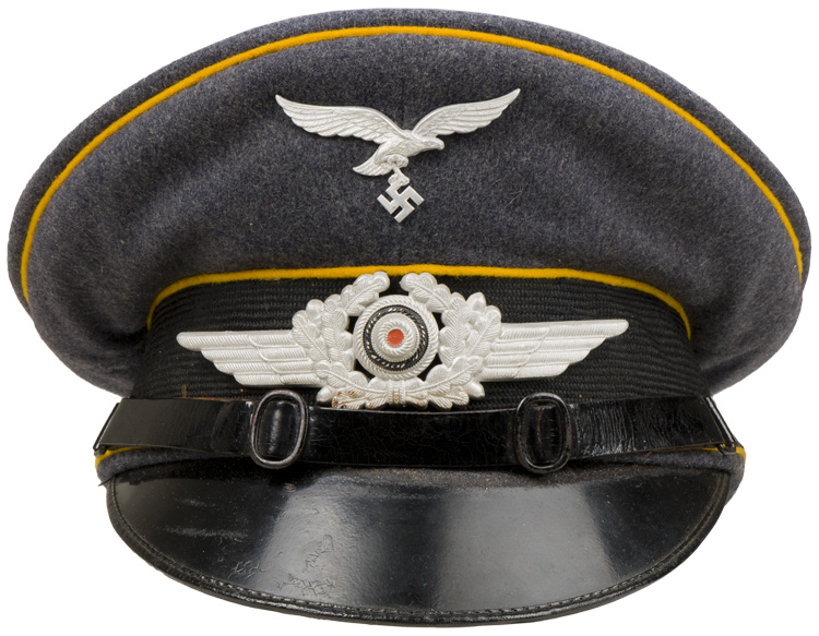 BACKGROUND: Visor caps were a standard item for all military personnel during the Third Reich period, (Circa 1933-1945), and regulations dictated the form of dress they were to be worn with, based on the individual’s rank. On its inception on February 26TH 1935, the Luftwaffe, (Air-{Weapon}, Force), adopted most of the uniform items of the earlier DLV, Deutscher Luftsport Verband, (German Air Sports Association), the clandestine, civilian forerunner of the Luftwaffe, including the visor cap. In March 1935 the earlier, "Tellerform", saucer shaped, caps were replaced with a new a "Sattelform" saddle shaped, cap with a higher front peak and an oval shaped top. The insignia utilized on the visor caps consisted of the Luftwaffe style national eagle as introduced for wear by Fliegerschaft, (Pilot Base), personnel of the DLV on August 18TH 1934 and was officially adopted for wear by all Luftwaffe personnel on March 1ST 1935 along with a new, winged, wreath and the national tri-color cockade. The original, first pattern, Luftwaffe style, national eagle was utilized until a slightly modified, second pattern national eagle was introduced in late 1936 or early 1937. The visor caps for Company and Field grade Officers, holding the ranks of Leutnant up to Oberst were distinguished from EM/NCO’s caps by bright, silver/aluminum piping and a silver/aluminum chin cord while Officers holding Generals ranks of Generalmajor up to Reichsmarschall utilized gold colored fittings. EM/NCO ranks visor caps utilized the appropriate waffenfarbe, (Branch of Service Color), piping and blackened leather chinstraps. Officers and certain senior NCO ranks were responsible for purchasing their own caps and as a result were allotted a clothing allowance through the Luftwaffe’s Verkaufsabteilung, (Air-Force Sales Department), system. The Officers and certain senior NCO’s could choose to purchase their caps from the armed forces clothing depots or to privately purchase visor caps of higher quality. Although enlisted personnel were issued their caps from government supplies they were also permitted to purchase privately tailored caps although the price may have been restrictive. The different branches of service within the Luftwaffe were allocated a specific, identifying, waffenfarbe, (Branch of Service Color), with golden yellow being chosen for Flieger, (Flight), personnel which was displayed as piping on EM/NCO’s visor caps.