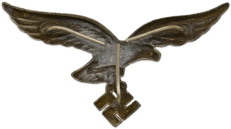 PHYSICAL DESCRIPTION: Silver washed, stamped alloy construction, second pattern, (Circa 1936/1937 1945), Luftwaffe eagle clutching a canted, swastika in one talon has a roughly, 68mm wingspan from wing tip to wing tip. All three original attachment prongs complete. Scarce.