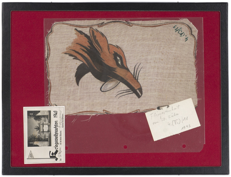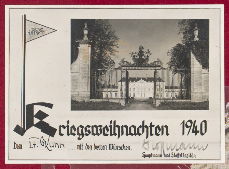 The original hand painted artwork by Leutnant Kuhn measures approximately 8" x 11." Accompanying the artwork is the original Christmas card given to Kuhn by Squadron commander Hauptmann Ulrich Hoffmann (c. 1 Sep 39 Mar 41) for Christmas 1940. There is a piece of paper pinned to the artwork which suggests the artwork was created in 1943. A rare and exceptional piece of original Luftwaffe squadron art, possibly created as the specimen for the unit insignia which was painted on all squadron aircraft.