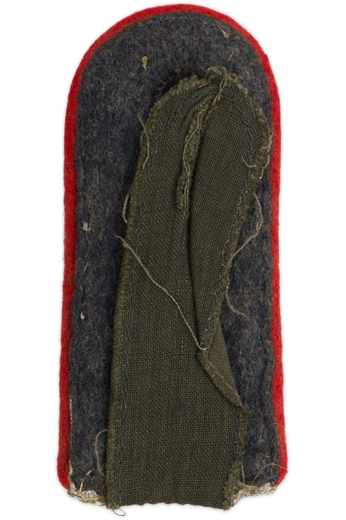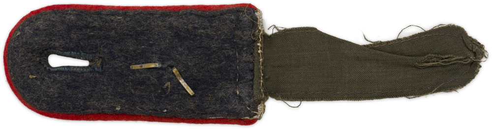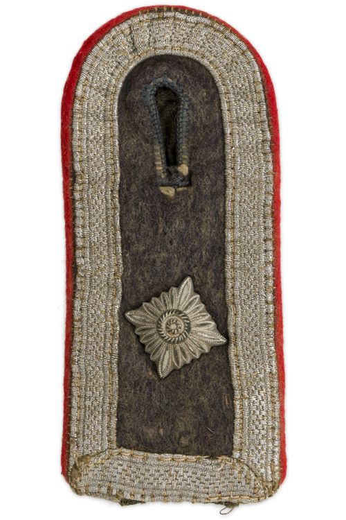 PHYSICAL DESCRIPTION: Luftwaffe blue/grey wool construction, slip on shoulder strap with red wool waffenfarbe piping. Bordered on all sides with bright silver/aluminum tress and with one aluminum rank pip.