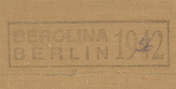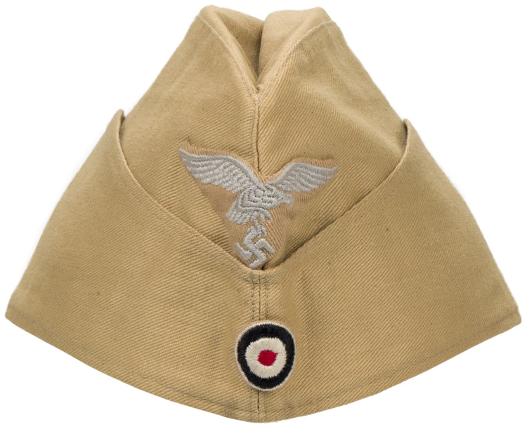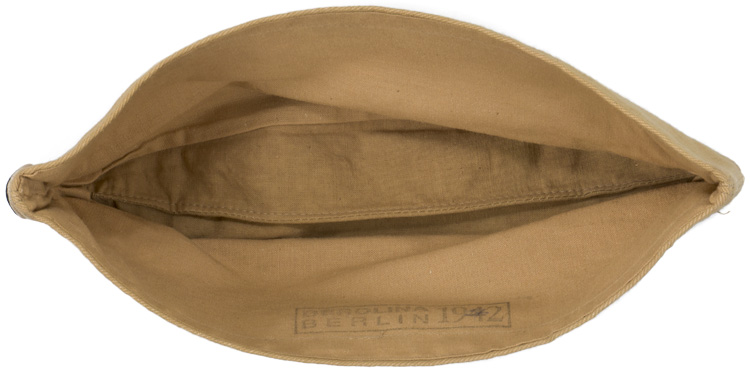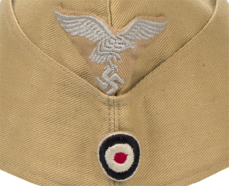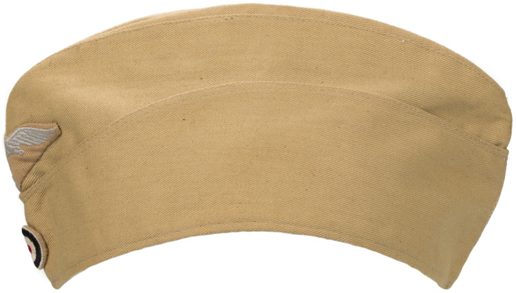PHYSICAL DESCRIPTION: Light weight, ribbed, tan cotton twill construction cap features fold down side and back panels with gently sloping, downward scallops to the front and forward sides. The front center of the cap has a machine embroidered, second pattern, tropical Luftwaffe eagle in pale silvery/grey threads on a ribbed, tan cotton twill base. The cotton twill base has been folded into an inverted triangle and is hand stitched in place. The front center of the cap has a machine embroidered, second pattern Luftwaffe eagle in silvery/grey threads on a cut out blue/grey wool base and the front center of the fold down panels has a machine embroidered, padded, national tri color cockade on a cut out tan rayon base. Both the eagle and the cockade are neatly handstitched to the cap. The interior of the cap is fully lined in light weight tan cotton. The lining is well marked with a faint, black manufacturers ink stamp with location and date, "Berolina Berlin 1942". Size marked 56. Very nice cap!