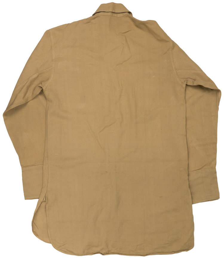 PHYSICAL DESCRIPTION: Early pattern, light weight, tan cotton construction, long sleeve, pullover shirt with an integral lay down collar. The shirt features a vertical, three button, front closure plaquet which runs from the neckline down to the waistline. The shirt has two pleated, patch, breast pockets with scalloped button down flaps. Buttons all look to be original stitching. Roughly a size 38" chest.