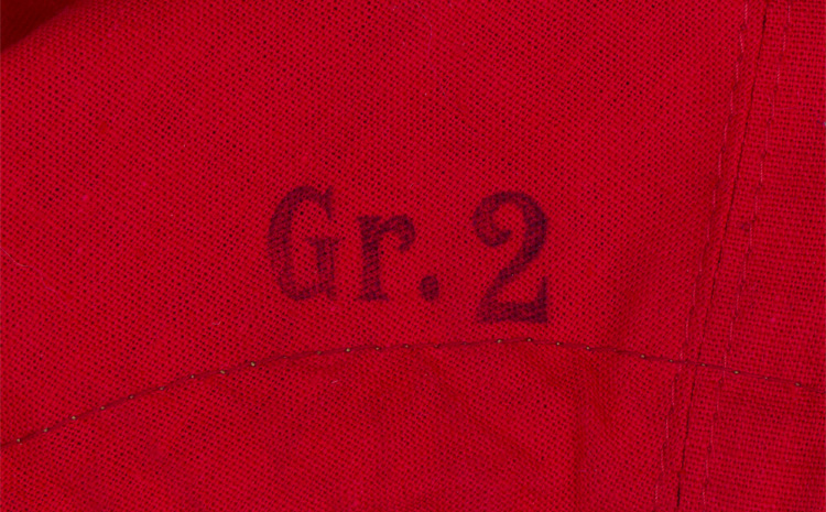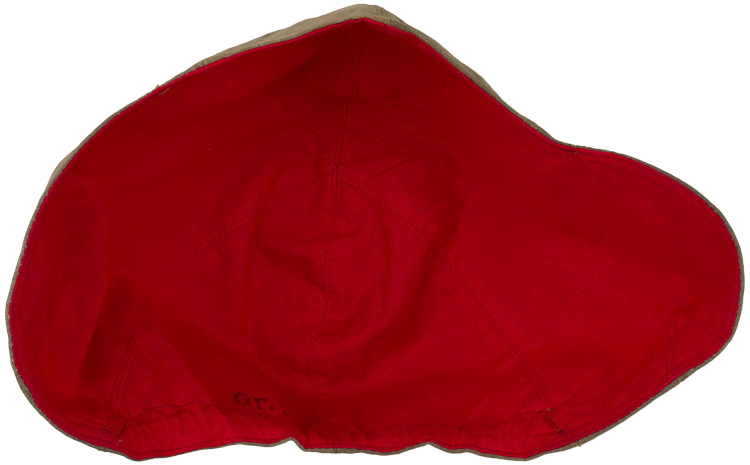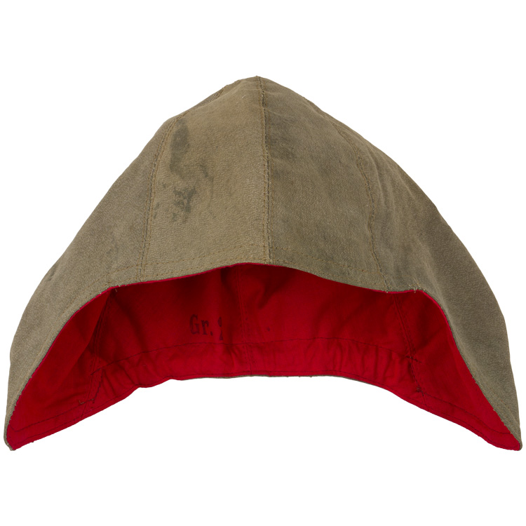 PHYSICAL DESCRIPTION: Reversible, six panel, light weight, dual-ply, mottled tan cotton and bright red, cotton/rayon blend construction protective flight helmet cover with machine stitched seams. One side of the cover is in bright red, cotton/rayon material while the other side is in mottled tan cotton. The cover has two, small, forward and back triangular panels and two larger, unique shaped side panels all with machine stitched seams. The side panels of the cover each have downward extended, semi-circular contours to fit over the earphones mounts. The red side of the cover is well marked with the black inkstamped size, "Gr.2", (Medium). Scarce protective flight helmet cover.