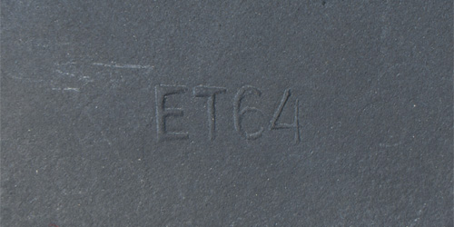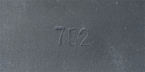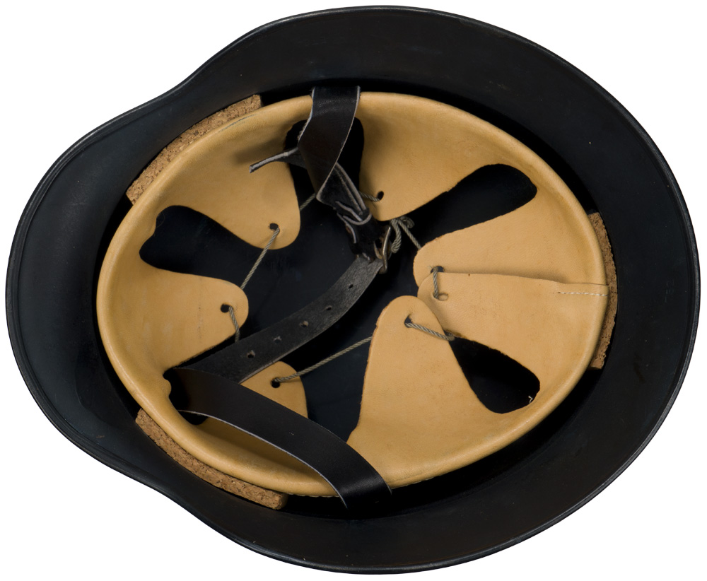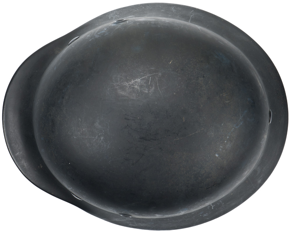 PHYSICAL DESCRIPTION: Stamped sheet steel construction, M40 style helmet with the addition of an embossed horizontal "bead" positioned at the apex of the front and rear visors and crown. The helmet retains almost 100% original dark blue satin finish. No decal was ever applied. All three liner retaining rivets and both inset ventilation bushings are all intact. The interior of the helmet has a leather, seven finger liner. Chinstrap is complete. Apron is stamped with the faint, manufacturer's code and size "ET 64" indicating manufacture by Eisen und Hüttenwerke, AG Thale/Harz, size 64. I have never seen one in better condition ever!