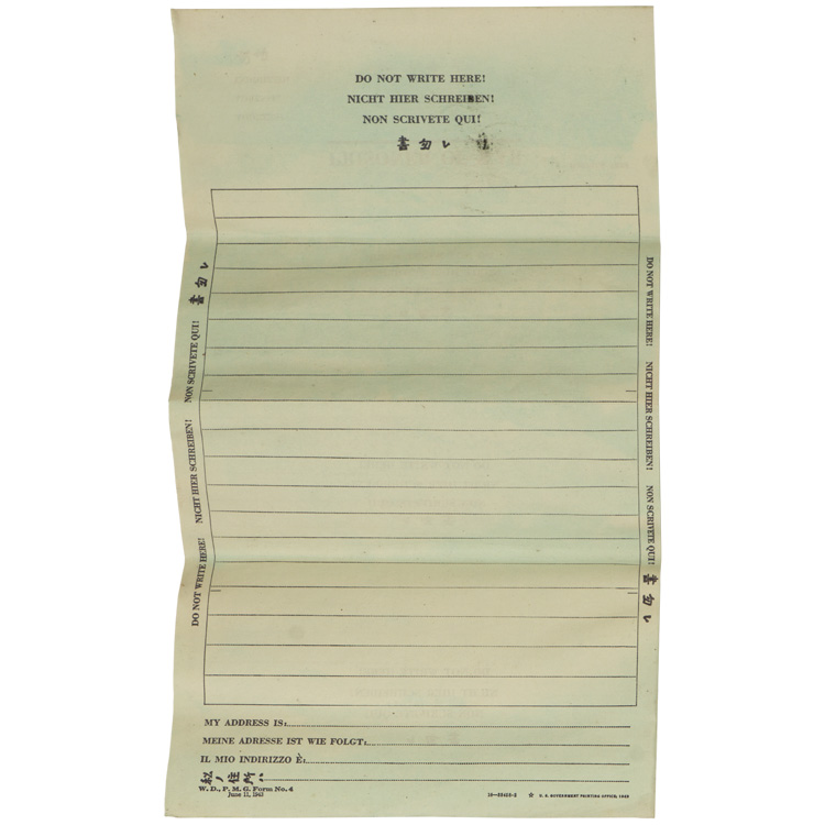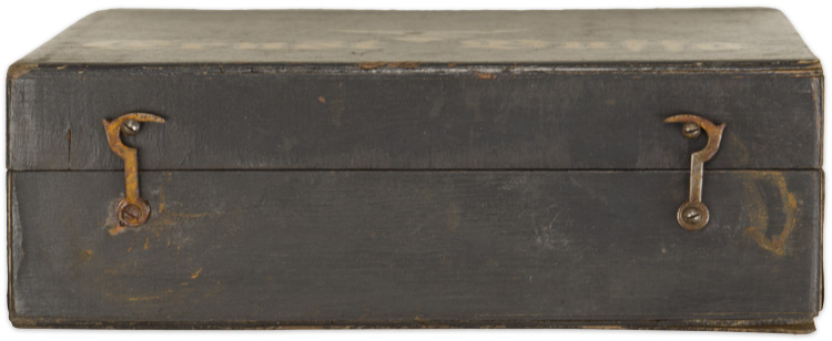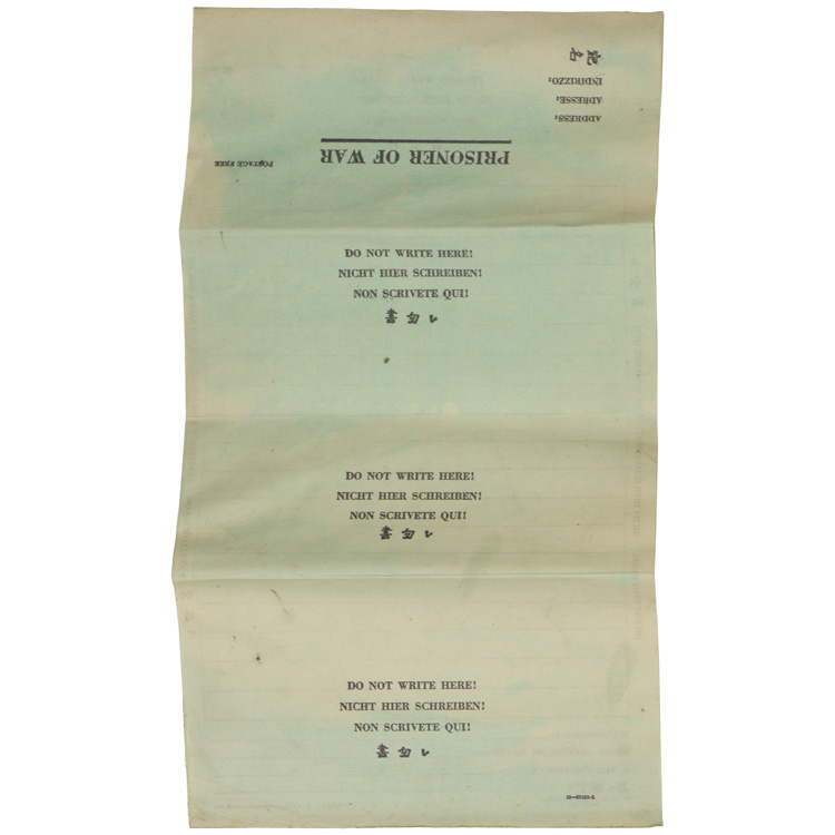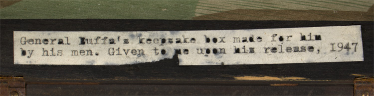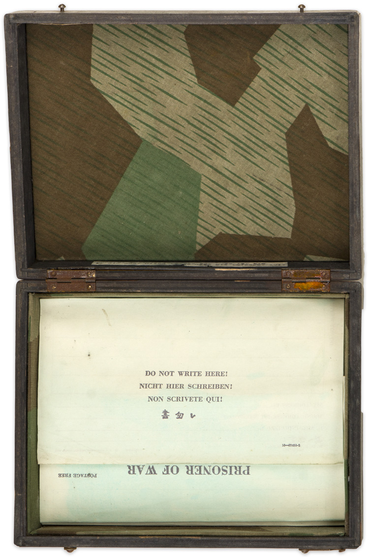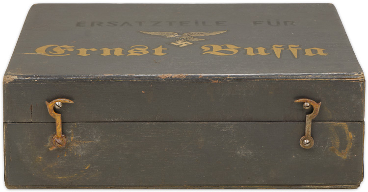 A 7.5cm x17cm x 22cm grey painted, wooden box with hinged lid. Painted to the lid are the words "ERSATZTEILE FÜR ERNST BUFFA" OR "SPARE PARTS FOR ERNST BUFFA" along with a Luftwaffe eagle decal. To the interior of the box is lined in a section of splinter pattern camouflage. Included are four pages of "Prisoner of War" letterhead that are dated for 1943. A section of typewritten paper is glued along the bottom edge of the lid that reads "General Buffa’s keepsake box made for him by his men. Given to me upon his release 1947." Of Note: Ernst Buffa was in American captivity from 7th May 1945 until 5th June 1947.