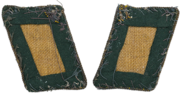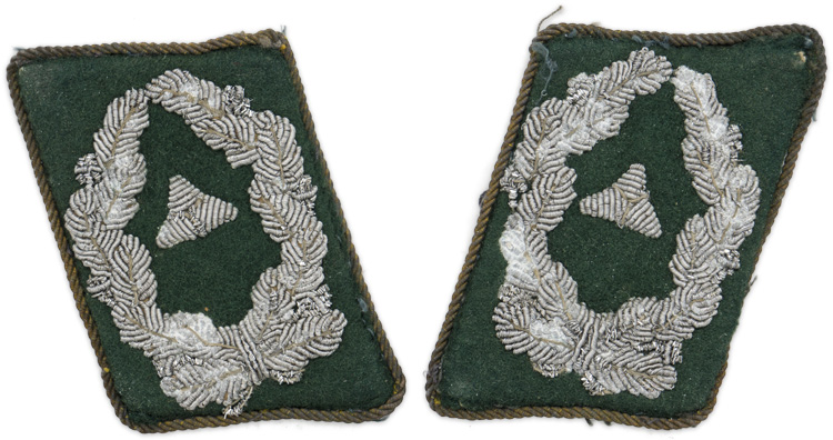 PHYSICAL DESCRIPTION: Dark green wool construction collar tabs with a single hand embroidered triangular rank/position pip positioned inside a full oak leaf half wreath all in bright silver/aluminum wire threads. The collar tabs are piped in twisted wire cord and are mounted on buckram backings. Luftwaffebeamte Oberkriegsverwaltungsrat (Major equivalent).