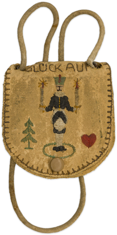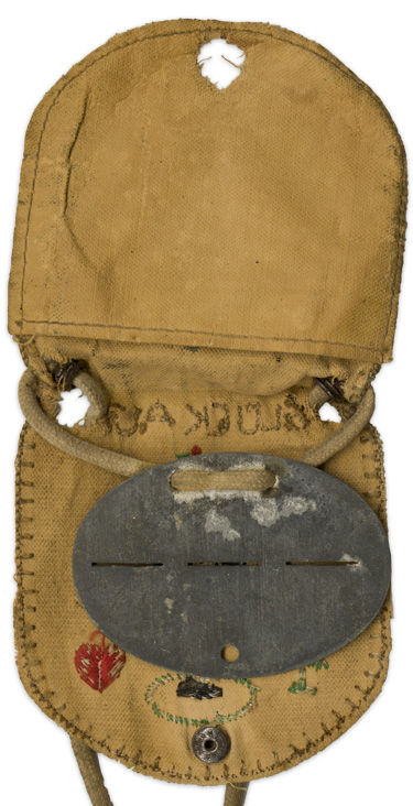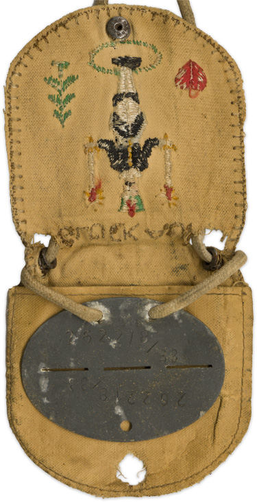 Extremely rare steel dog tag on its original thick cord in original chamois pouch with hand-embroidered traditional figures and words "Gluck Auf" ("Good Luck"). Steel identity tag is stamped 202218 / 33, an identified paratrooper unit designated as Erprobungsstaffel Langendiebach b/Hanau/XI. Flieger Korps. The XI. Flieger Korps was the code name at the beginning of the war for the Corps commanding all paratrooper units. This unit, the "Testing Squadron" for the Parachute Corps, was the unit which tested all methods and equipment for parachute drops, such as experimental techniques for jumping with weapons and new equipment such as the FG42 parachute assault rifle. The men of the unit were all experienced paratroopers with over 100 parachute jumps who were qualified to test potentially dangerous new parachuting methods and experimental equipment. This unit developed the RZ16 and RZ20 parachutes after the problems with the RZ1 parachute and harness in mass drops were identified. The / 33 on the tag indicates the man who carried this was the 33 original member of the unit. The chamois pouch is hand made with considerable skill, and was perhaps made for the paratrooper by a wife or girlfriend, as it does not appear to be a commercially produced item. Very rare and historical unit dog tag.