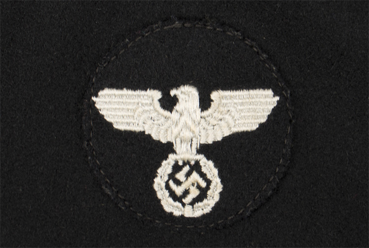 PHYSICAL DESCRIPTION: Superb quality, double breasted, black wool construction. Blue collar with pink wool piping. Sew on shoulder straps for the rank of Feuerwehrmann. Sleeve eagle with original stitching to the upper left sleeve. All buttons are complete and look to have original stitching. Chest size 40". The example was used in the Berlin Luftministerium building! Superb condition and rare to find!