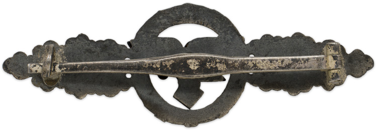 PHYSICAL DESCRIPTION: Two piece, die struck zinc construction clasp. The clasp is in the form of a central, circular, embossed, laurel leaf wreath, with a static swastika superimposed to the bottom center, encompassing a separate, cut out, stylized eagle in flight clutching a canted swastika in it’s talons. The eagle is secured to the clasp with a single, small, dome headed, rivet which is visible on the reverse. The clasp has three, overlapping, parallel, rows of embossed oak leaves extending horizontally outward from either side of the central wreath. The clasp shows nice detailing. The solid reverse of the clasp has a small, soldered, barrel type hinge, a broad tapering horizontal pin, and a heavy soldered catch all intact. The clasp has no visible manufacturer’s markings.