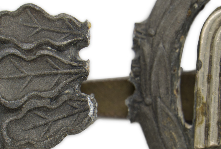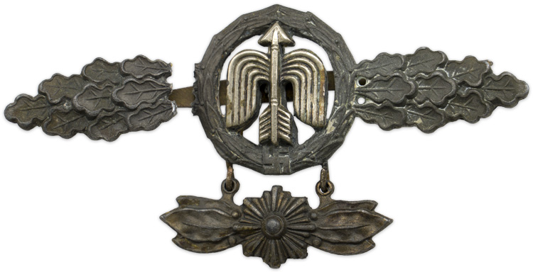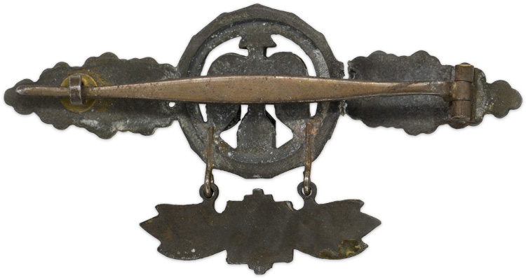 PHYSICAL DESCRIPTION: Die struck, two piece, zinc construction clasp. The clasp is in the form of a central, circular, laurel leaf wreath, with a static swastika superimposed to the bottom center, encompassing an upward pointing, winged arrow. Three overlapping, parallel rows of oak leaves extend horizontally outward from either side of the central wreath. The winged arrow is attached to the claps by a small flat headed rivet which is visible on the reverse. The solid reverse of the clasp has a solid soldered hinge, a broad, tapering horizontal pin and original catch. The reverse, bottom edge of the central laurel leaf wreath has two, small, soldered on, vertically extended arms with looped ends to secure the pendant to the clasp. The die struck alloy pendant is in the form of a horizontally aligned, embossed central star burst pattern flanked on each side by three, small, overlapping, horizontally extended laurel leaves The top edge of the laurel leaves have two small cut out loops for the securing arms. The solid reverse of the pendant is plain. Clasp will need a repair.