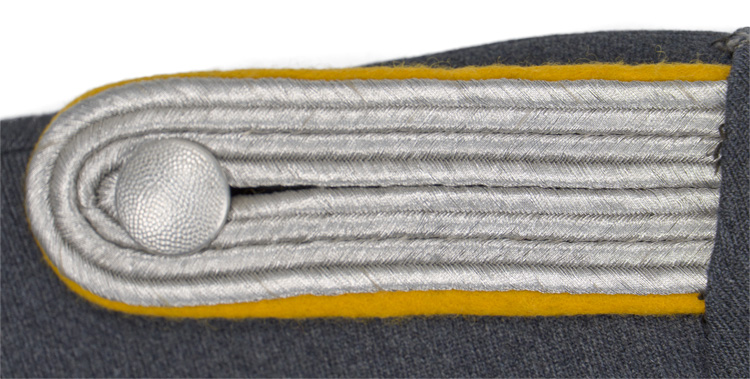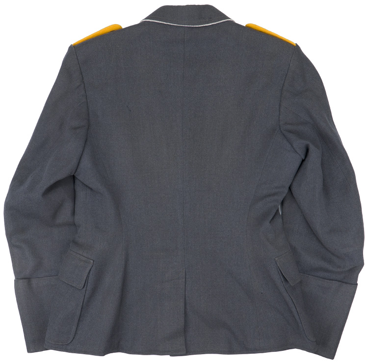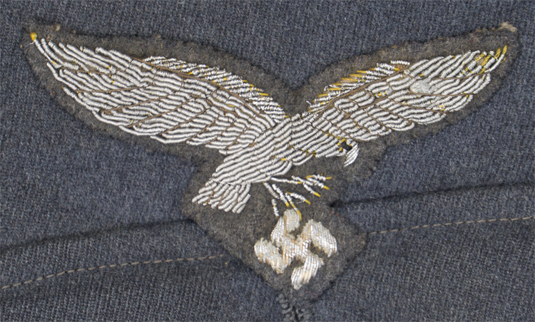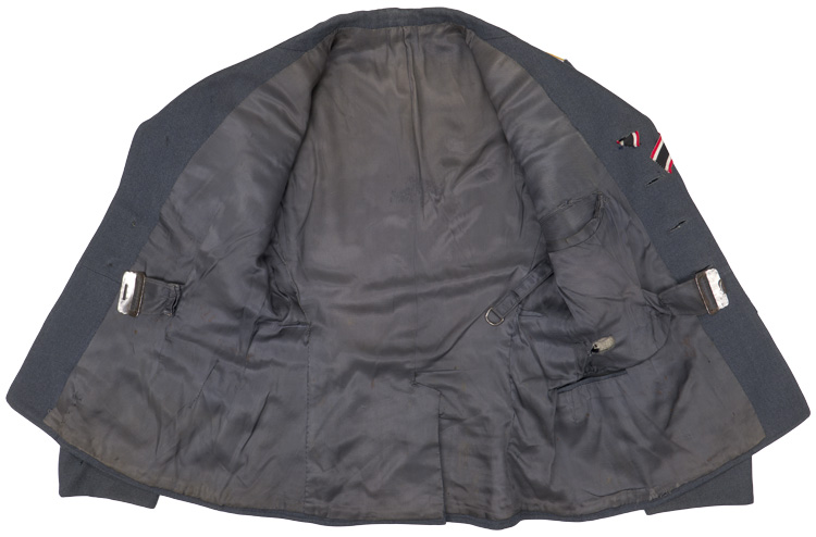 PHYSICAL DESCRIPTION: Private purchase, 1935 pattern, Luftwaffe blue/grey, wool/rayon blend construction tunic with a pronounced whipcord weave. The tunic features a vertical, four button front closure with small, upswept, fold back lapels and a lay down collar. The tunic has four, pleated, patch, front pockets with straight edged button down flaps. The right breast has a hand embroidered Luftwaffe eagle in bright silver/aluminum wire threads with grey cotton thread accents on a cut out blue/grey wool base. The eagle is neatly handstitched to the tunic. Original award loops for two breast badges. KVK2 Ribbon to button hole. The straight cut sleeves have deep fold back French cuffs which are tacked in the upright position at both the inner and outer sleeve seams. The tunic has sewn on shoulder boards of bright silver/aluminum Russian braid on golden yellow wool waffenfarbe bases. The forward edge of the collar is trimmed in bright, twisted, silver/aluminum cording. The collar has golden yellow wool collar tabs with a single hand embroidered rank "gull" and oak leaf wreath all in bright silver/aluminum wire threads. The collar tabs are also trimmed with bright, twisted, silver/aluminum cording and are hand stitched to the collar. The interior of the tunic is fully lined in grey rayon with off white, striped sleeves. The buttons are all the bright, silver washed, pebbled magnetic sheet metal type and appear to have their original stitching. One small sewing repair to the right sleeve. The tunic is roughly size 34" chest. One tiny sewing repair to the lower left pocket. Nice worn and used example showing the expected age and wear. Very decent example with all original insignia application.