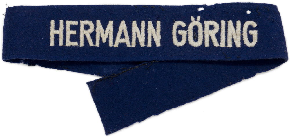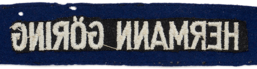 PHYSICAL DESCRIPTION: Deep, navy blue, doeskin wool construction cufftitle with machine embroidered block letter Latin script, "Hermann Göring" in light silver/grey threads. The cufftitle is roughly 32mm wide and roughly 40cm long. A few tiny moth holes. Uniform removed.