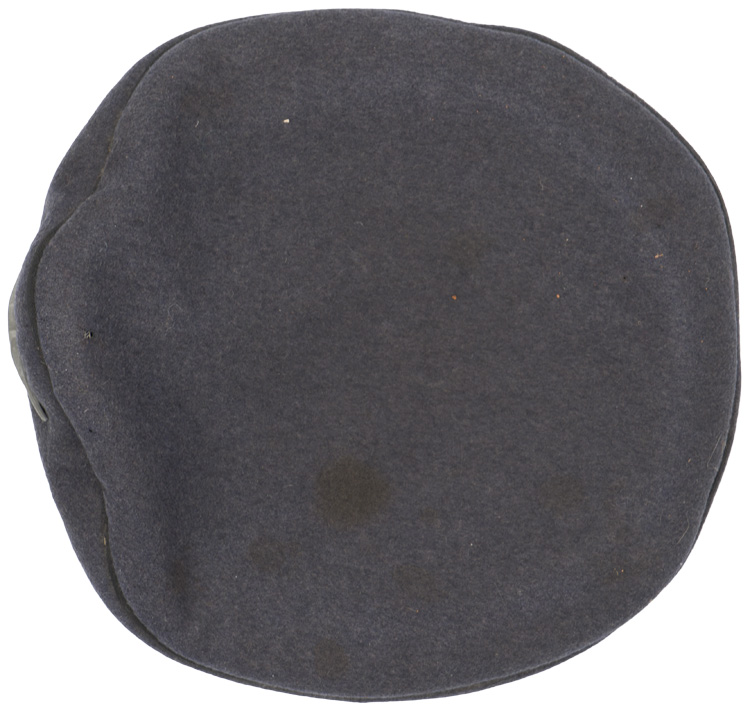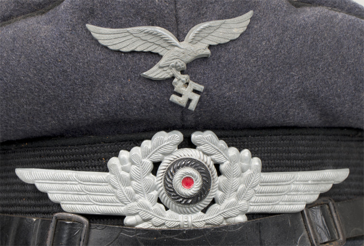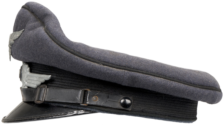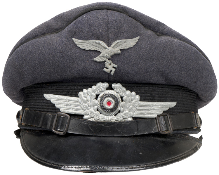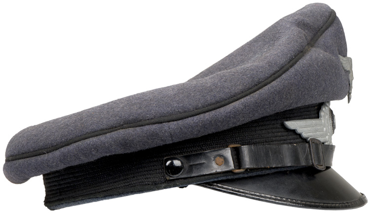 PHYSICAL DESCRIPTION: Private purchase, Luftwaffe blue/grey wool/rayon blend construction cap. The cap features a black, horizontally ribbed, interwoven, mohair centerband and black wool waffenfarbe to the crown edge and both the top and bottom edges of the centerband. The front center of the cap has a stamped zinc, second pattern Luftwaffe eagle and the front center of the centerband has a stamped zinc winged wreath with a painted national tri color cockade. The cap has a black patent leather chinstrap with two, black painted, rectangular, sheet metal, retaining clips and two, black painted, rectangular, sheet metal sliding length adjustment buckles. The chinstrap is secured to the cap by two, smooth, black painted, sheet metal buttons. The cap has an extended, forward, black lacquered, fibre visor with stitched on simulated leather trim to the forward edge. Visor has pulled loose and will need to be re-stitched. Lining is complete and still retains its original celluloid sweat shield with makers mark. Leather sweatband is complete. Cap is roughly a size 55 or 56. Scarce black piped Luftwaffe visor.
