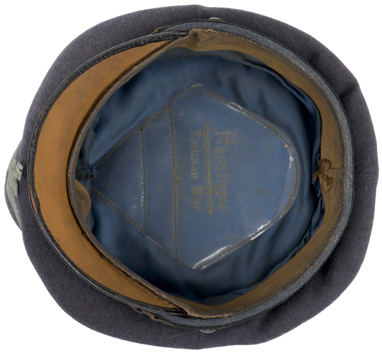 BACKGROUND: Visor caps were a standard item for all personnel during the Third Reich period and regulations dictated the form of dress they were to be worn with based on the individuals rank. On its inception on February 26TH 1935, the Luftwaffe adopted most of the uniform items of the earlier DLV, Deutscher Luftsport Verband, (German Air Sports League), its civilian forerunner, including the visor cap. In March 1935 the earlier, "Tellerform", saucer shaped, caps were replaced with a new a "Sattelform" cap with a higher front peak and an oval shaped top. Officer and certain senior NCO ranks were responsible for purchasing their own caps and could choose to purchase them from the armed forces clothing depots or to privately purchase visor caps of higher quality. Although enlisted personnel were issued their caps from government supplies they were also permitted to purchase privately tailored caps although the price may have been restrictive. Company and Field grade Officer’s caps were distinguished from the EM/NCO’s caps by bright silver/aluminum piping and a silver/aluminum chin cord while General Officer’s ranks utilized gold colored fittings. EM/NCO ranks utilized the appropriate branch of service piping and blackened leather chinstraps. The different branches of service within the Luftwaffe were allocated a particular identifying waffenfarbe color with black being chosen for personnel on the permanent staff of the RLM, Reichsluftfahrtministerium, (National Air Ministry), and building and construction units. RLM personnel discontinued use of the black waffenfarbe on June 30TH 1939, and regulations of December 22ND 1939 allocated the black waffenfarbe to building and construction unit personnel.