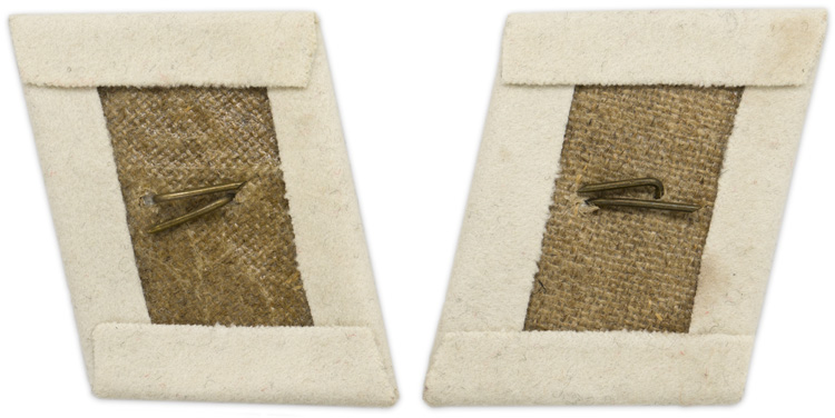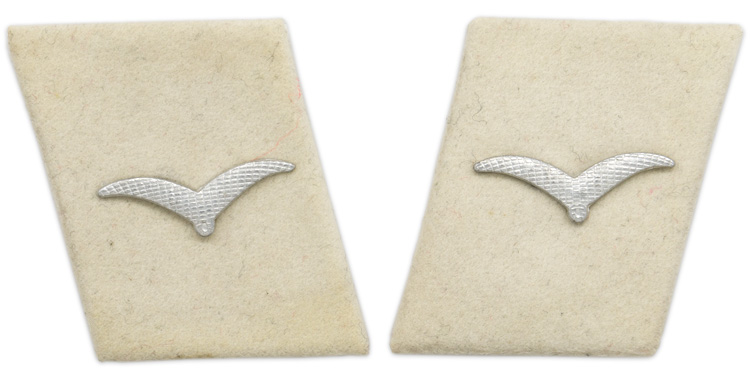 PHYSICAL DESCRIPTION: Post April 1943 pattern, un piped, white wool construction collar tabs with a single, stamped, natural alloy "gull" to each. The collar tabs are mounted on off white, buckram backings.