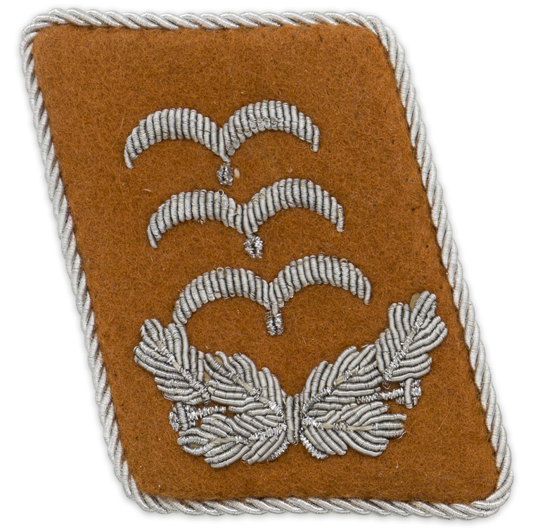 BACKGROUND: The Reichsluftwaffe was officially established on February 26TH 1935 as the third branch of service of the German Armed Forces. On March 9TH 1935 the formation of the new Reichsluftwaffe was announced to the foreign press and on March 16TH conscription was reintroduced for all three branches of service. On May 21ST 1935 the Reichsluftwaffe designation was altered to Luftwaffe. Collar tabs were adopted by the newly formed Luftwaffe on April 14TH 1935 and followed the basic pattern of the collar tabs that had been utilized by the DLV, Deutscher Luftsportsverband, (German Air Sports Association), the Luftwaffe’s clandestine civilian forerunner. The collar tabs were worn in matching pairs and indicated the branch of service and rank of the wearer. The different branches of service within the Luftwaffe were allocated specific identifying waffenfarbe, (Branch of Service Color), with light brown being chosen for personnel serving with Nachrichtentruppen, (Signals), units which was generally displayed as the base color of the collar tabs.
