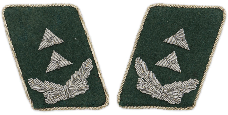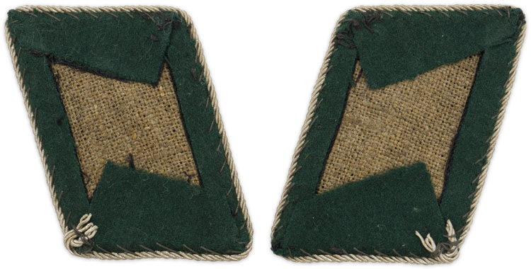 PHYSICAL DESCRIPTION: Dark green wool construction collar tabs with two hand embroidered triangular rank/position pips positioned above an opened top, oak leaf half wreath all in bright silver/aluminum wire threads. The collar tabs are piped in twisted bright silver/aluminum cords and are mounted on buckram backings. Luftwaffebeamte Kriegsoberinspektor (1st Lieutenant equivalent).
