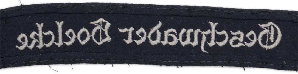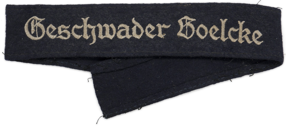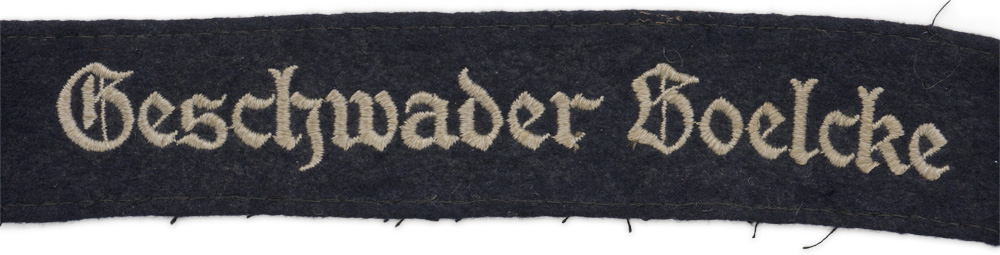 PHYSICAL DESCRIPTION: Roughly 38mm tall, 40cm long, EM/NCO's pattern, deep navy blue, woven wool construction cufftitle with machine embroidered, Gothic styled script, "Geschwader Boelcke", in silvery/grey cotton threads. The cufftitle has both the top and bottom edges machine stitched down to the reverse and has the typical opened back revealing the reverse of the embroidered script with a loosely woven white fabric backing. Uniform removed.