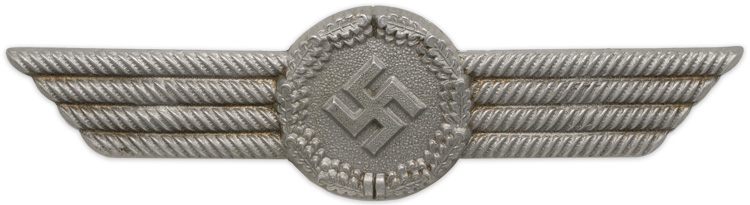 The German armed forces had a tradition, dating from the 1700's, of maintaining a separate branch of Administrative Official’s attached to the army to oversee all administrative functions, thus freeing up active army Officers and allowing them to concentrate on actual military matters. The Officials were responsible for a wide variety of administrative tasks from Court Martial, Librarian, Supply, Technical and Meteorological Services, to School, Barracks, and Hospital administration. On it’s inception the Luftwaffe also established an Administrative branch of service that included the Feuerschutzbeamte der Luftwaffe, (Fire Protection Officials of the Air Force). One function of the Feuerschutzbeamte was to provide fire fighting and protection services to all Luftwaffe airbases, depots, installations etc. The Feuerschutzbeamte utilized civilian employees mainly drawn from civil fire departments. Both the officials and the civilian employees were not granted the status of soldiers but were classified as Angehörige der Luftwaffe, (Members of the Air Force). The officials and the civilian employees originally wore dark blue uniforms and headgear that was similar to the Feuerschutzpolizei, (Fire Protection Police), with different insignia for each group. Regulations of November 1940 altered the officials uniform to the standard Luftwaffe blue/grey, with different insignia, although the civilian employees continued to wear the dark blue uniform and headgear. The headgear worn by the officials and civilian employees included a visor cap that was basically identical to the standard Luftwaffe visor cap but in a different color and different insignia. The civilian fire brigade personnel were allocated crimson waffenfarbe, (Branch of Service Color), which was displayed as piping on EM/NCO’s visor caps.PHYSICAL DESCRIPTION: Roughly 110mm winged aluminum wreath with a swastika to the center. Complete with original prongs. Scarce.