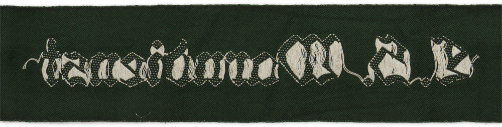 PHYSICAL DESCRIPTION: Full length, woven green rayon construction cufftitle with machine woven Gothic script, "L.S. Warndienst", (Air Raid Warning Service), in silver/grey rayon threads. The top and bottom edges of the cufftitle have interwoven rows of reinforcement stitching and both ends have dual-ply machine stitched seams. One end of the cufftitle has the machine woven manufacturer’s initials "K.R.A.N.", in silver/grey rayon threads.
