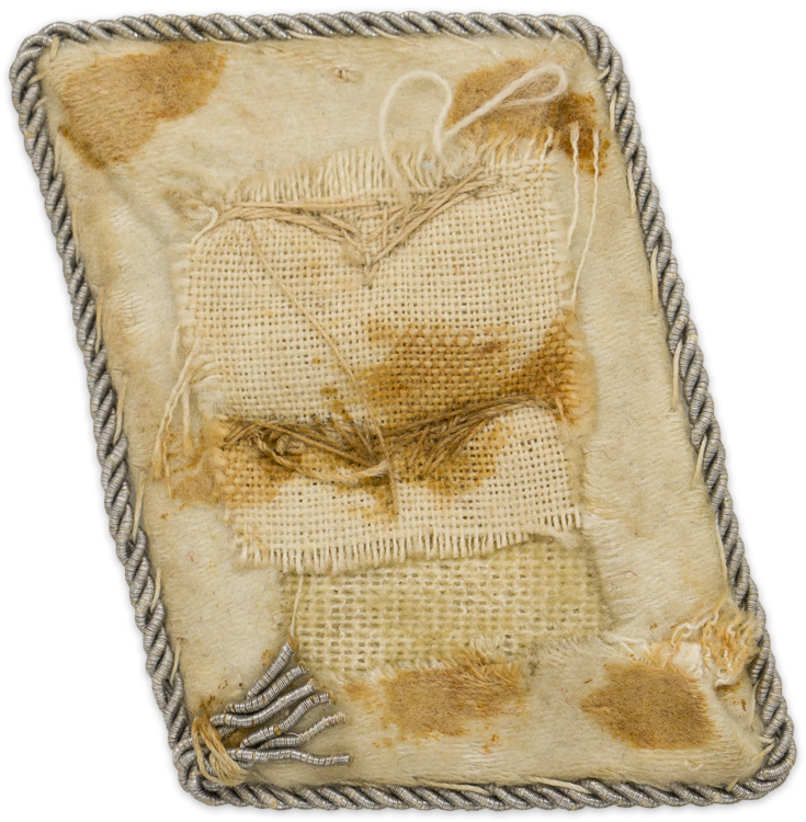 PHYSICAL DESCRIPTION: White wool construction collar tab with three hand embroidered rank "gulls" positioned above an opened top, oak-leaf half-wreath all in bright silver/aluminum wire threads. The collar tab is piped in twisted bright silver/aluminum cord and mounted on light buckram base.