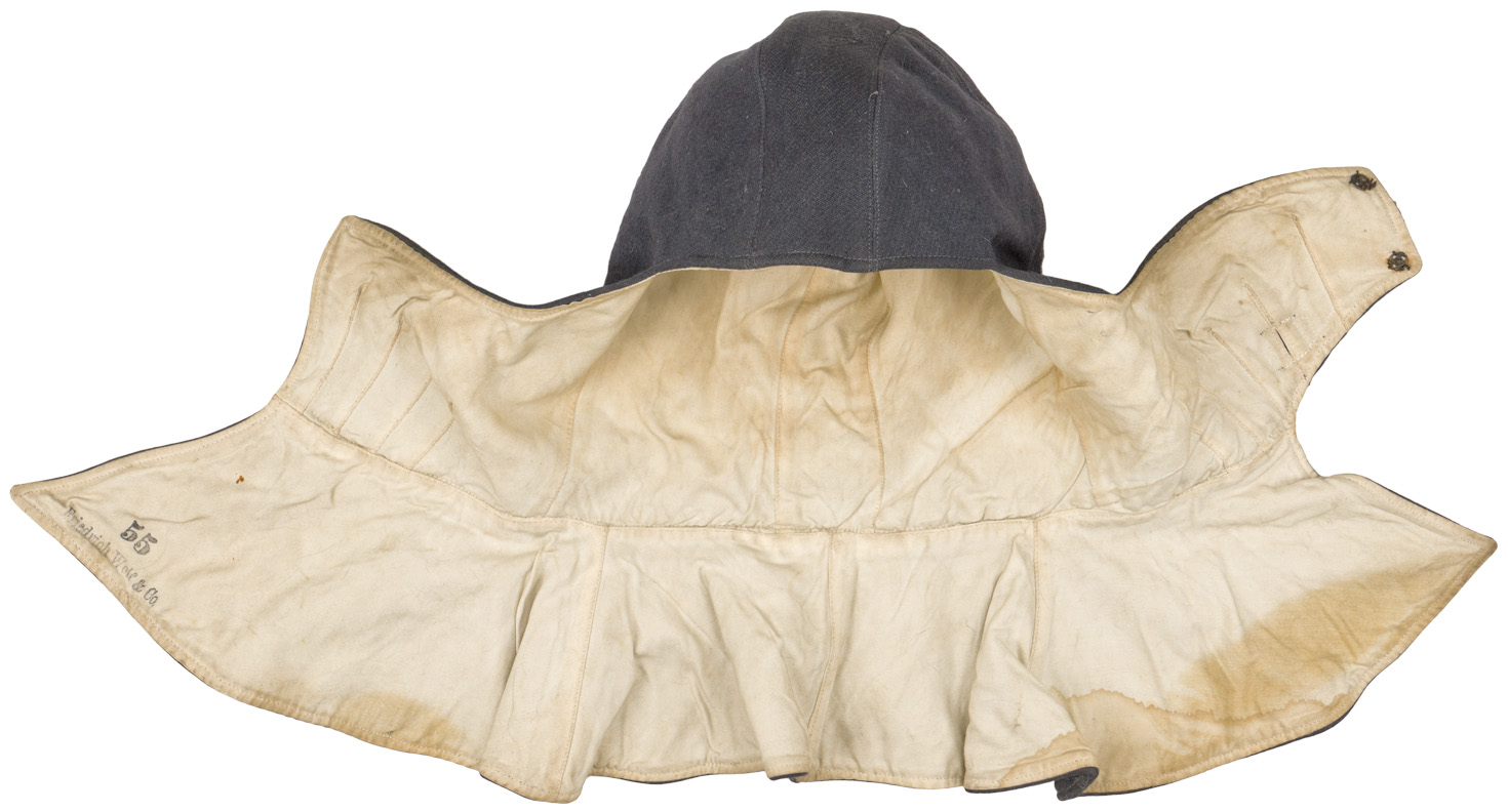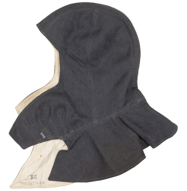 PHYSICAL DESCRIPTION: Field-grey wool/rayon blend construction winter hood with an internal padding, reversible to white. Two small snaps have been period added to affix the hood in the closed position. Nice markings.