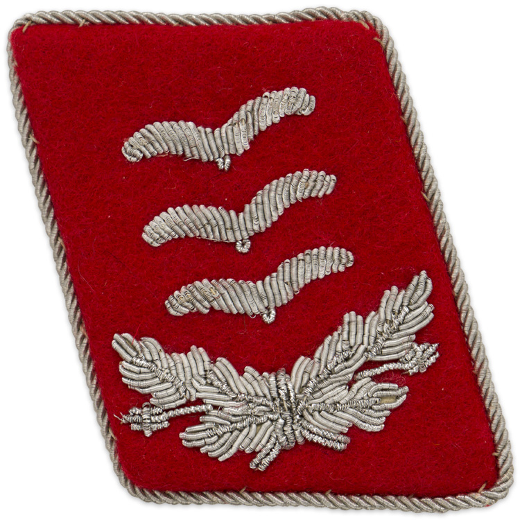 BACKGROUND: The Reichsluftwaffe was officially established on February 26TH 1935 as the third branch of service of the German Armed Forces. On March 9TH 1935 the formation of the new Reichsluftwaffe was announced to the foreign press and on March 16TH conscription was reintroduced for all three branches of service. On May 21ST 1935 the Reichsluftwaffe designation was altered to Luftwaffe. Collar tabs were adopted by the newly formed Luftwaffe on April 14TH 1935 and followed the basic pattern of the collar tabs that had been utilized by its earlier civilian forerunner the, DLV, Deutscher Luftsport Verband, (German Air Sports League). The collar tabs were worn in matching pairs and indicated the branch of service and rank of the wearer. The different branches of service within the Luftwaffe were allocated specific identifying waffenfarbe, (Branch of Service Color), with bright red being chosen for personnel serving with the Flakartillerie, (Anti-Aircraft Artillery), units which was generally displayed as the base color of the collar tabs.