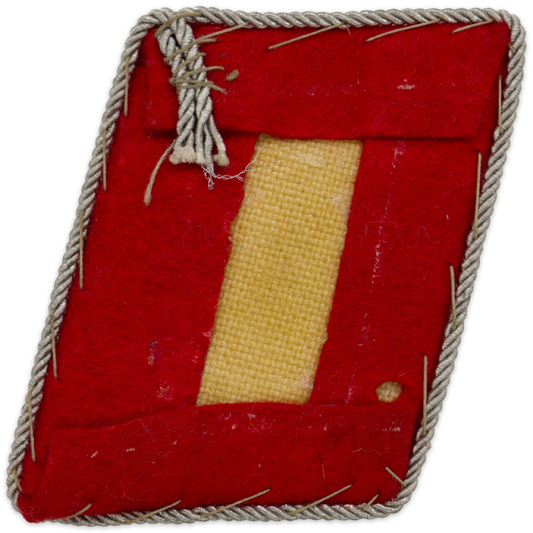 PHYSICAL DESCRIPTION: Bright red wool construction collar tab with three hand embroidered rank "gulls" positioned above an opened top, oak-leaf half-wreath all in bright silver/aluminum wire threads. The collar tab is piped in twisted bright silver/aluminum cord and is mounted on a buckram backing.