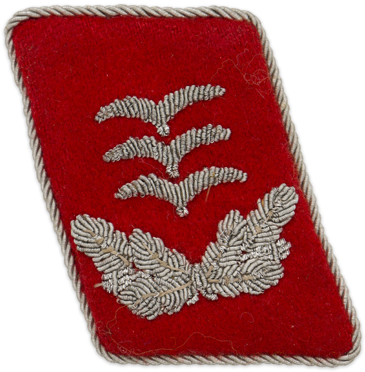 BACKGROUND: The Reichsluftwaffe was officially established on February 26TH 1935 as the third branch of service of the German Armed Forces. On March 9TH 1935 the formation of the new Reichsluftwaffe was announced to the foreign press and on March 16TH conscription was reintroduced for all three branches of service. On May 21ST 1935 the Reichsluftwaffe designation was altered to Luftwaffe. Collar tabs were adopted by the newly formed Luftwaffe on April 14TH 1935 and followed the basic pattern of the collar tabs that had been utilized by its earlier civilian forerunner the, DLV, Deutscher Luftsport Verband, (German Air Sports League). The collar tabs were worn in matching pairs and indicated the branch of service and rank of the wearer. The different branches of service within the Luftwaffe were allocated specific identifying waffenfarbe, (Branch of Service Color), with bright red being chosen for personnel serving with the Flakartillerie, (Anti-Aircraft Artillery), units which was generally displayed as the base color of the collar tabs.